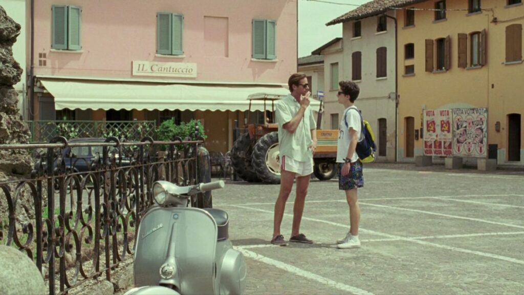O filme também constrói uma atmosfera idílica em torno da relação entre os dois personagens. A casa ensolarada, o ambiente intelectual da família de Elio e o verão italiano criam um cenário em que o desejo parece natural e livre de consequências. Dentro desse espaço, o romance assume a forma de uma experiência intensa, quase suspensa no tempo.