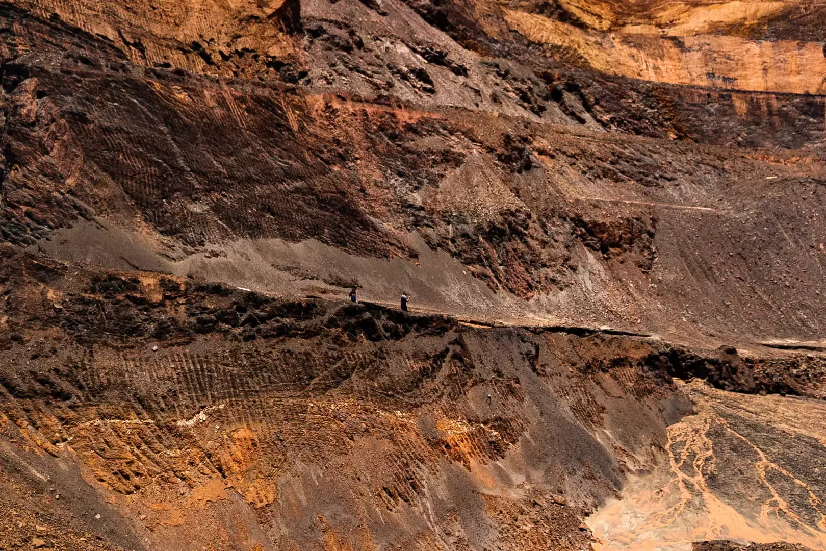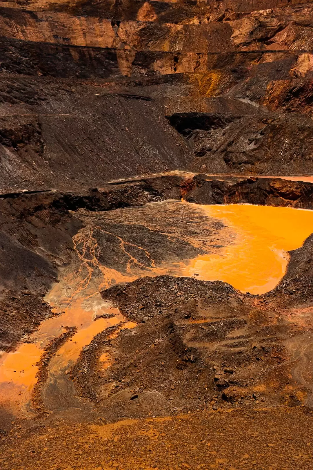 Quando chegamos ao chão vermelho, vimos a terra devastada e repleta de pedregulhos. Depois, avançamos para a parte mais profunda da cava, acessível por um pequeno morro, que nos levou a um gigantesco buraco repleto de degraus. No interior daquela grande fissura na Serra, a terra, antes avermelhada, assume tons de cinza, e uma grande poça de água assinala a parte central e mais profunda da cava.