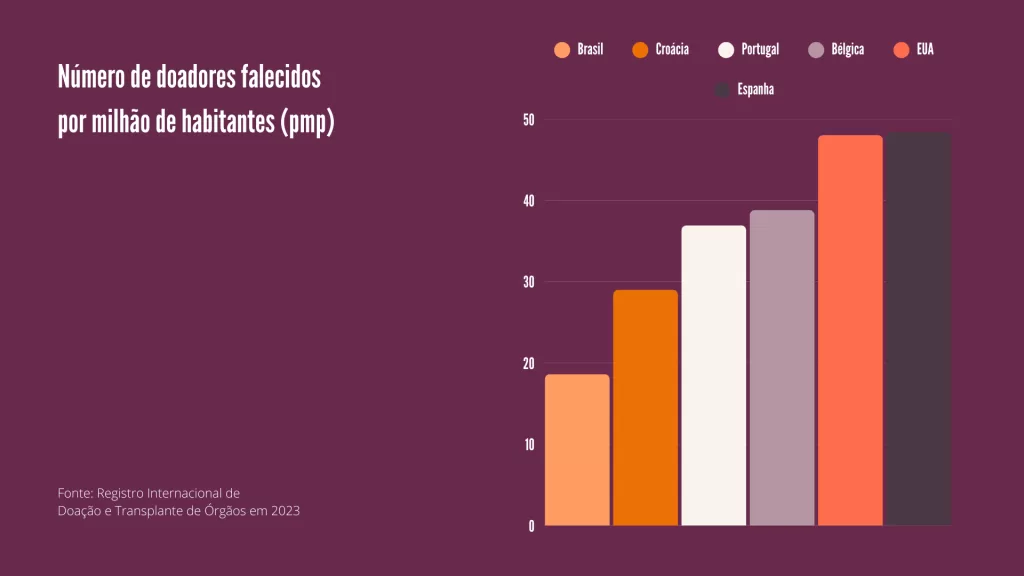 Questões religiosas, familiares ou até problemas de tratamento hospitalar representam algumas das barreiras que o processo de doação de órgãos ainda enfrenta no Brasil. Um estudo realizado pelo Registro internacional de Doação e Transplantes de Órgãos em 2023 aponta que o Brasil possui aproximadamente 18,65 doadores falecidos por milhão de habitantes (pmp), valor abaixo de países como Espanha (49,38 pmp), Estados Unidos (48,04 pmp), Portugal (36,93 pmp), Bélgica (35,81 pmp) e Croácia (29,00 pmp).