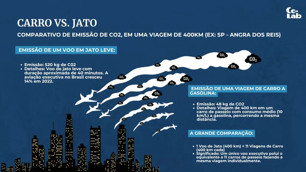 A empresa tem mais de 4.300 aeronaves cadastradas ao redor do mundo e faz aproximadamente 3 viagens por dia. Uma escala muito utilizada é São Paulo para Angra dos Reis, 400 km. O modelo de aeronave mais vendida do mundo, já citada anteriormente, emite 1,3 kg de CO₂ por quilômetro. Em uma dessas viagens, 520 quilogramas. Em três dessas viagens, 1.560 quilos.