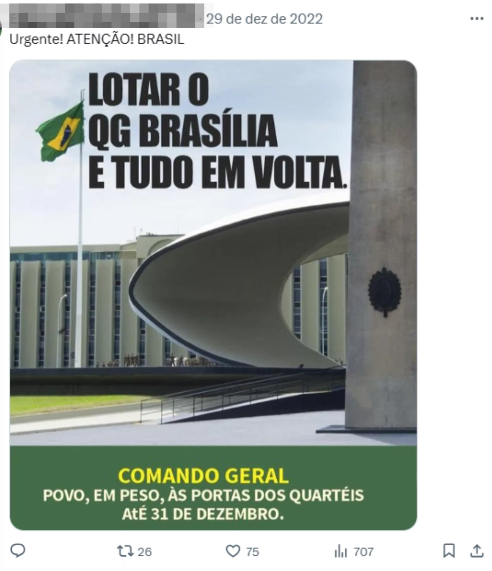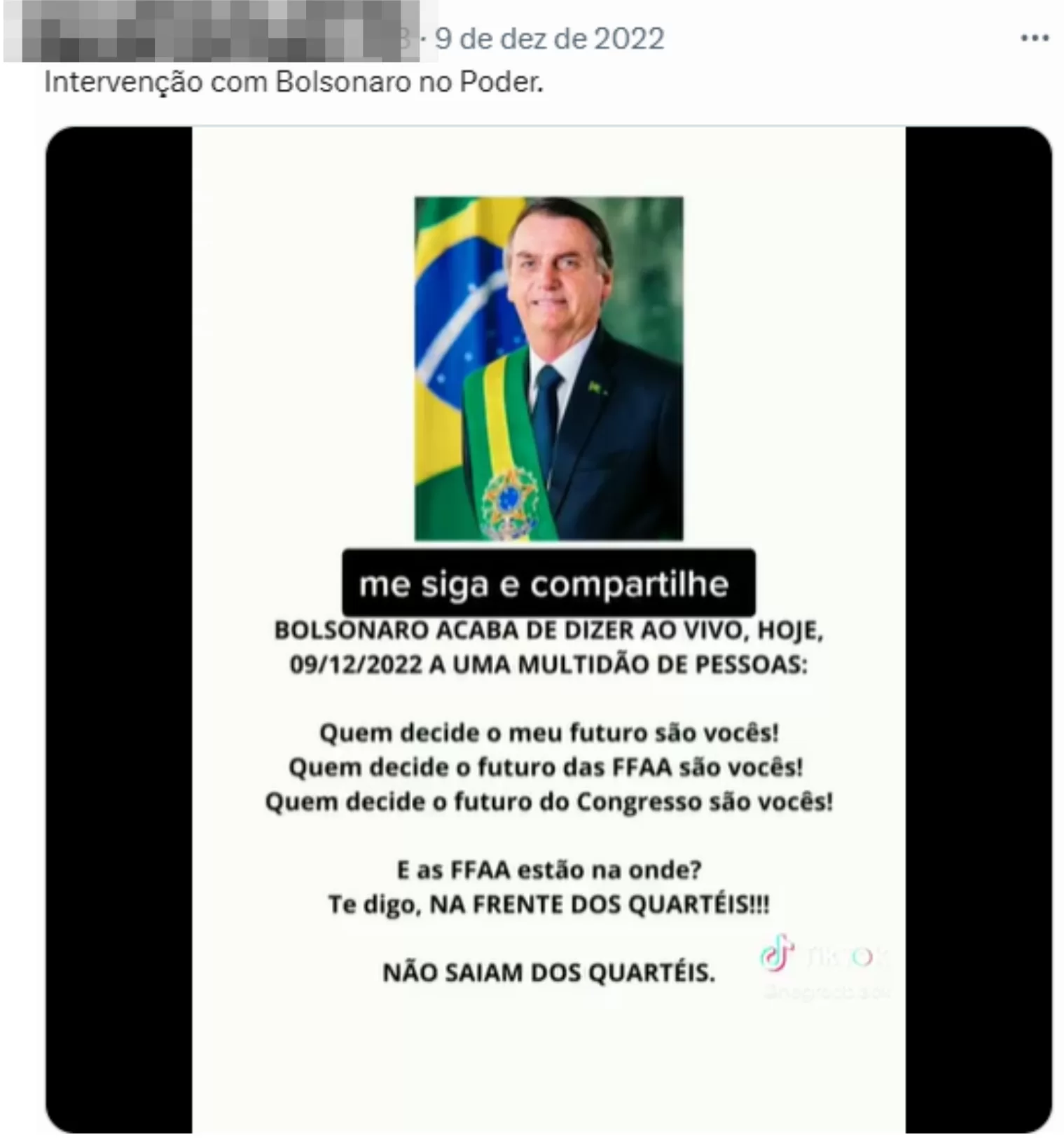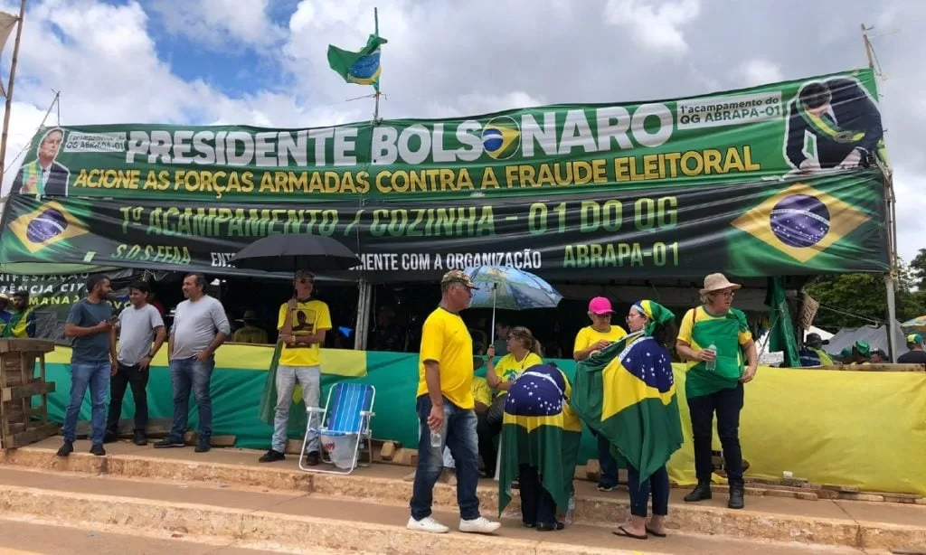 Logo após o segundo turno das eleições presidenciais de 2022, no dia 1º de novembro, começaram a surgir manifestações em diversas cidades do Brasil, instigadas por apoiadores de Jair Bolsonaro (PL) que se recusavam a aceitar a vitória de Luiz Inácio Lula da Silva (PT). Esses atos, inicialmente apresentados como protestos “pacíficos”, pediam intervenção militar, deslegitimando o resultado das urnas. Convocados em redes sociais e por grupos de mensagens como o autodenominado Movimento Nacional de Resistência Civil (MNRC), os manifestantes repetiam símbolos e práticas típicas do bolsonarismo, como o uso de cores verde e amarela, bandeiras do Brasil, hino nacional e cartazes contra o STF e o TSE.