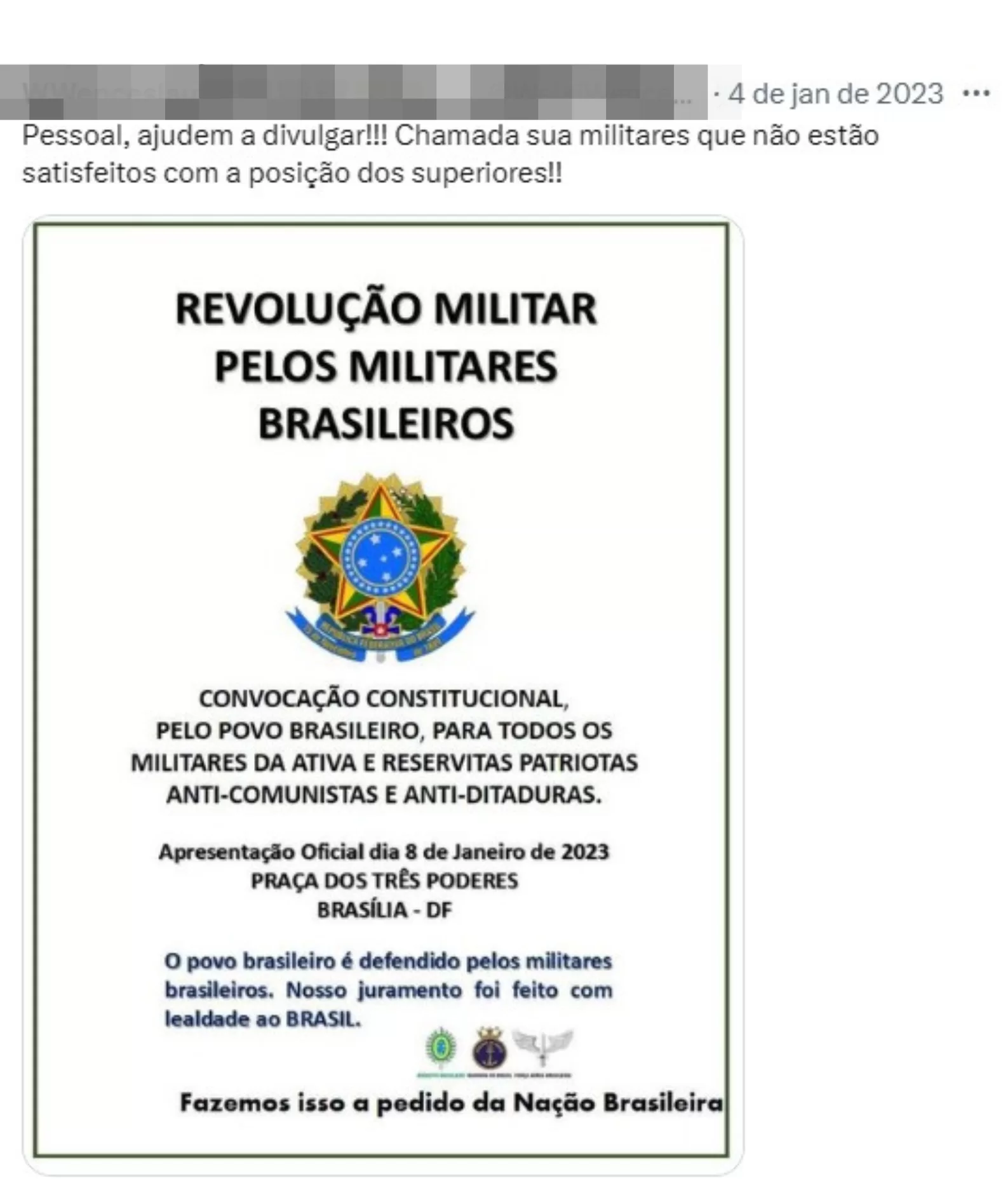 As articulações para o possível golpe circulavam nos grupos de WhatsApp desde novembro de 2022, com mensagens de estímulo para estarem em frente aos quarteis, a fim de manter a pressão para que Lula não assumisse, pedindo a intervenção das Forças Armadas. Enquanto isso, outro grupo tentava incentivar uma greve geral para paralisar o país e criar situação, que tentava impedir a posse de Lula.