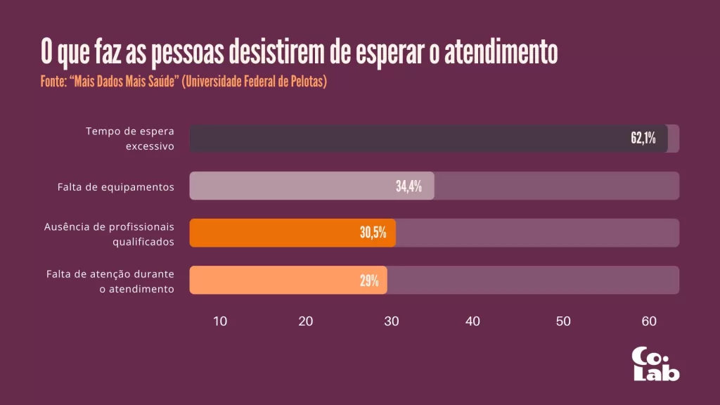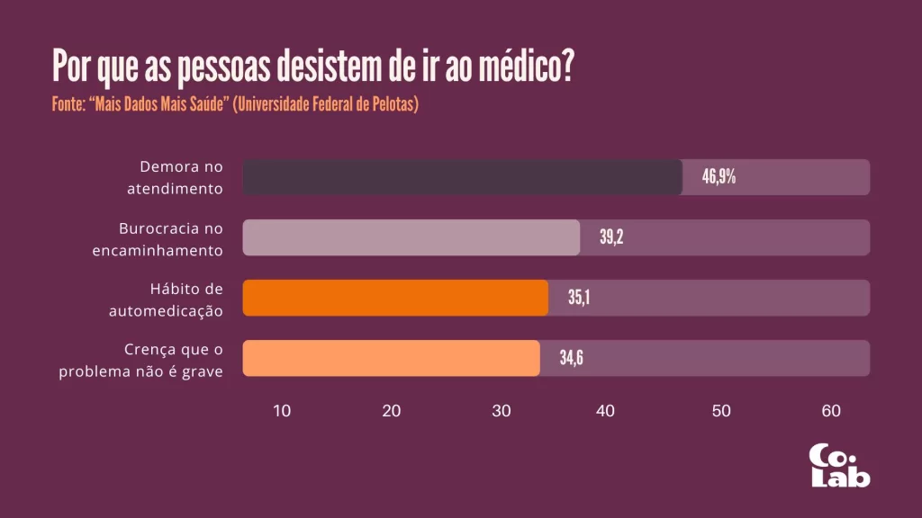 Além da desistência, os entrevistados também relataram que têm dificuldade de conseguir atendimento mesmo depois de procurar ajuda. Entre as respostas, 40,5% afirmam ter buscado atendimento médico sem sucesso. A causas também são variadas: